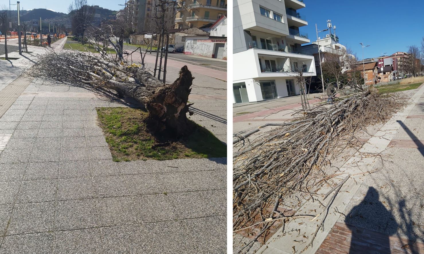 “Le forti raffiche di vento che stanno spazzando la città hanno provocato lo sradicamento di un albero su viale Parco. Cosenza è colpita in queste ore da forti raffiche di vento che hanno reso la situazione difficile per i residenti. Sarà compito del servizio di pulizia strade rimuovere i resti dell’arbusto.”
