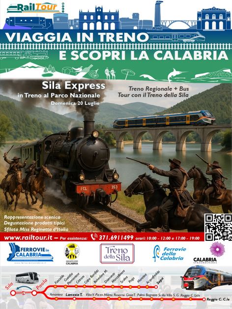 Il Sila Express prevederà partenze in treno Regionale da Reggio Calabria Centrale/Lamezia Terme Centrale e Sapri/Scalea (e tutte le relative fermate intermedie lungo il versante Tirrenico), con arrivo a Paola: da questa stazione, un transfert in bus dedicato, accompagnerà i partecipanti giunti in treno Regionale fino a Camigliatello Silano, da dove si partirà alla volta di San Nicola Silvana Mansio a bordo dello storico Treno della Sila di Ferrovie della Calabria, in occasione della seconda giornata del premio Miss Reginetta d’Italia 2025 che si svolgerà alla stazione di Sculca, dove ad opera degli amici dell’Associazione Turismo Ferroviario e Spettacolo Calabria si terrà anche l’imperdibile assalto al treno da parte dei briganti ed una ricchissima degustazione a base di prodotti tipici del territorio caldi e freddi. Il rientro è programmato in modo analogo, con ripartenza in autobus da Camigliatello Silano a Paola e rientro per le rispettive destinazioni in treno Regionale in direzione Lamezia Terme/Reggio Calabria e Scalea/Sapri. Per tutto il tragitto, i partecipanti saranno accompagnati a bordo dei treni e del transfert in bus, dal personale dell’Associazione Ferrovie in Calabria.