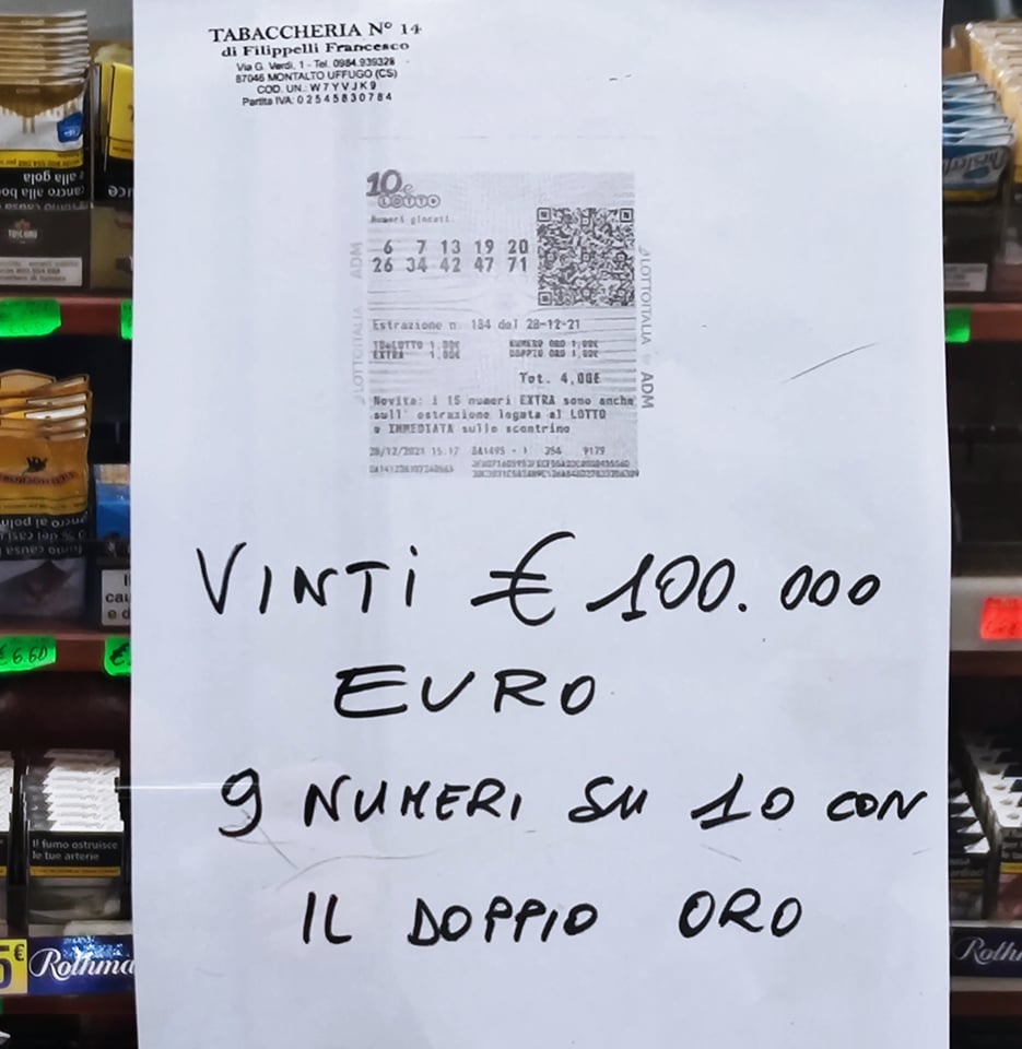 Vinti questo pomeriggio 100mila € a Taverna di Montalto Uffugo